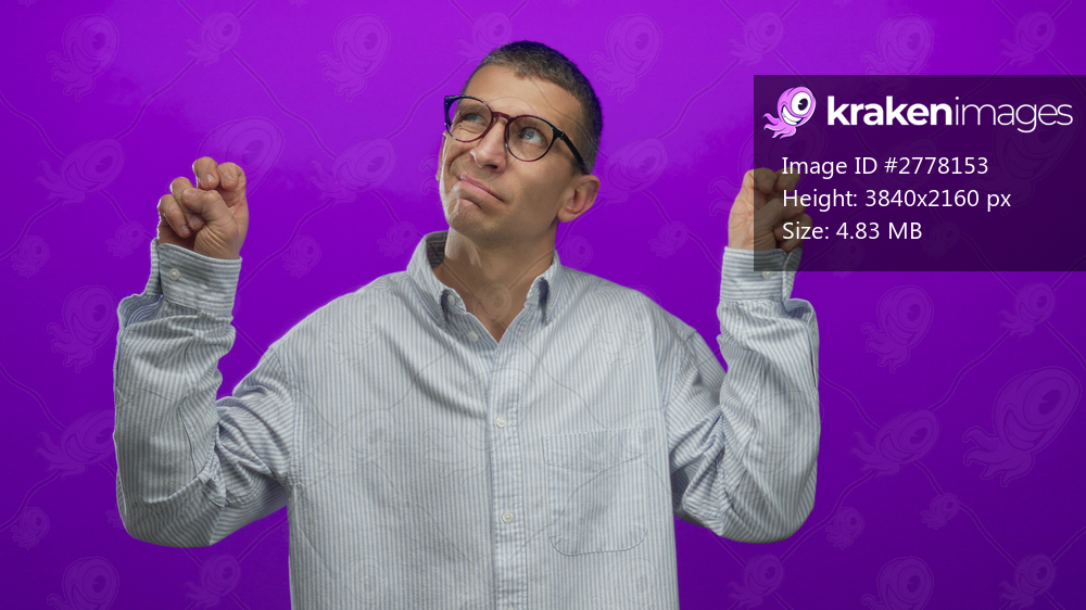 Caucasian man in glasses gesturing quotation marks on a vibrant purple background, isolated against the wall in a thoughtful pose wearing a striped shirt. - Kraken Images