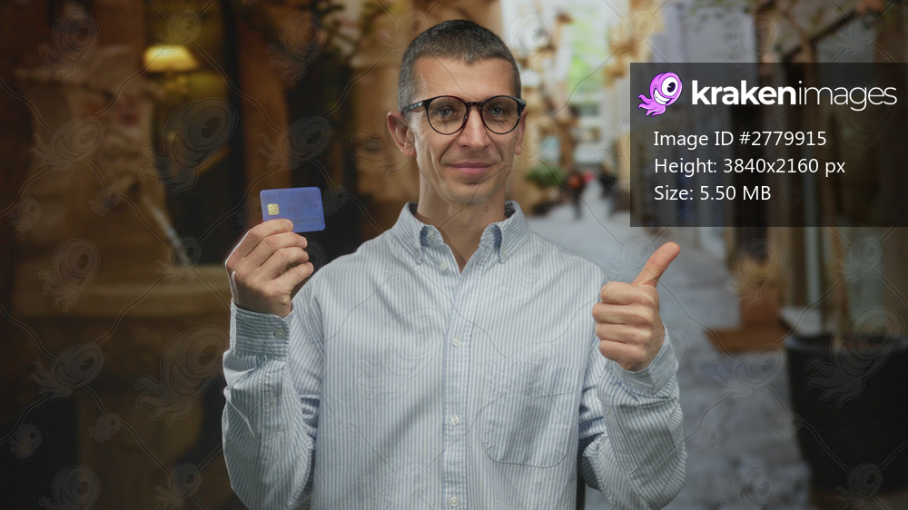 Caucasian man in glasses holding a credit card and giving a thumbs up gestures confidently on a picturesque european street with a blurred background.