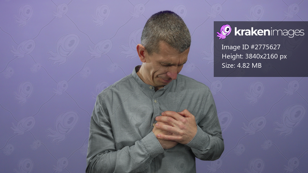 Caucasian man in gray shirt holds chest with emotional expression against a purple isolated background.
