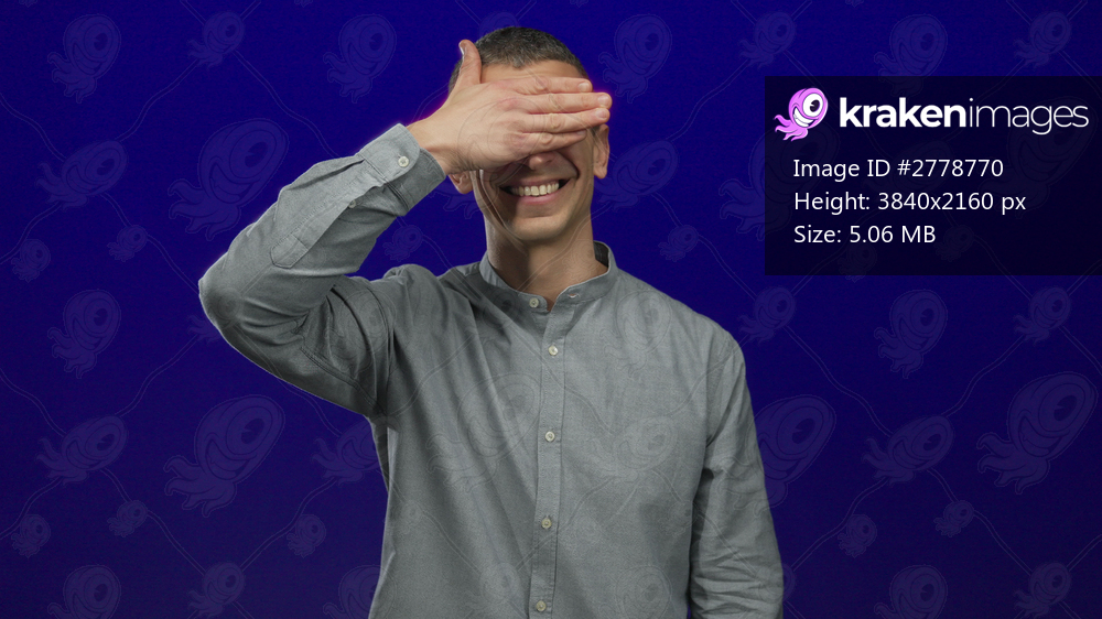 Caucasian man in gray shirt playfully covers eyes with hand against solid blue background, smiling and appearing cheerful in an isolated setting.