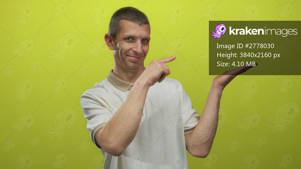 Caucasian man in white shirt gestures confidently with extended hand against vibrant yellow wall, isolated in studio setting, emphasizing presentation and positivity. - Kraken Images