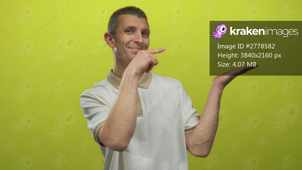 Caucasian man in white shirt gestures confidently with extended hand against vibrant yellow wall, isolated in studio setting, emphasizing presentation and positivity. - Kraken Images