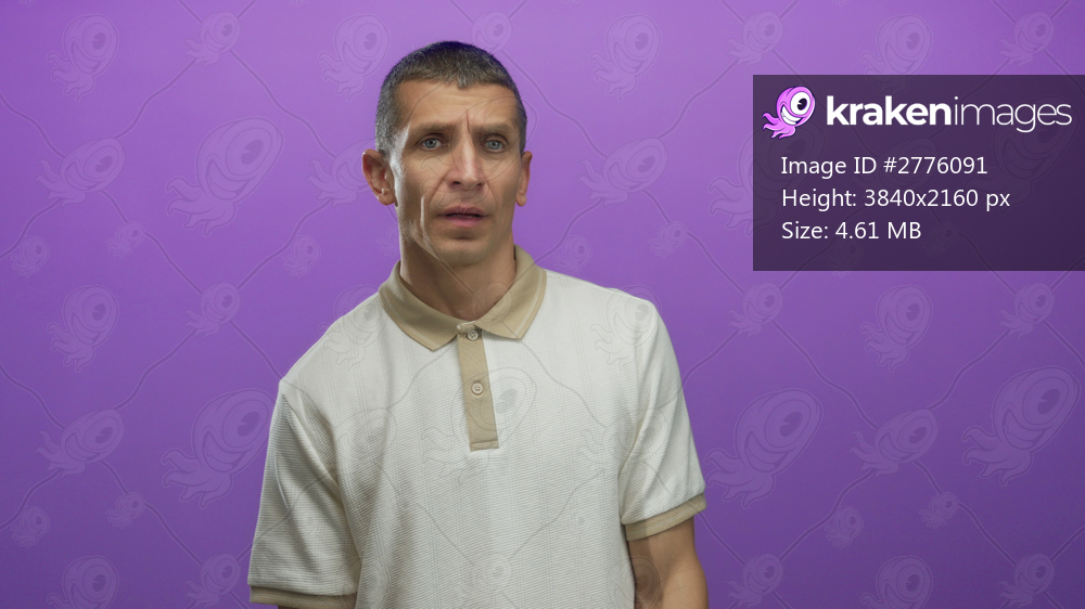 Caucasian man in white shirt holds chest with purple background, displaying emotion with isolated expression in studio setting, suggesting curiosity or surprise. - Kraken Images