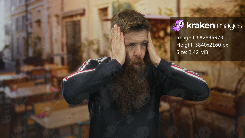 Caucasian man with long brown beard wearing dark sweatshirt pressing hands on ears on street; sensory overload frustration.