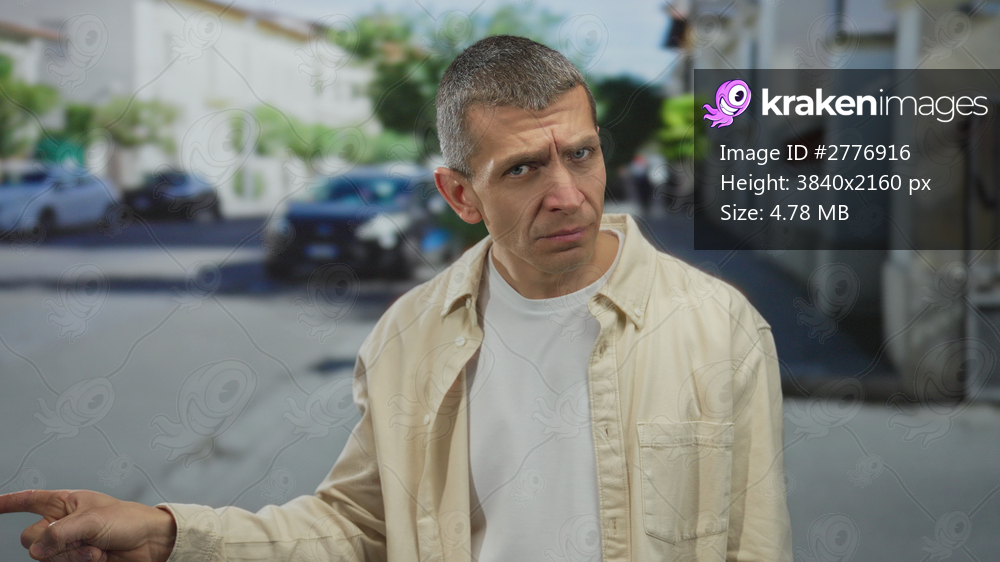 Caucasian man making gesture outdoors on a busy street, showing a serious expression during daylight, with parked cars and buildings visible in the background. - Kraken Images