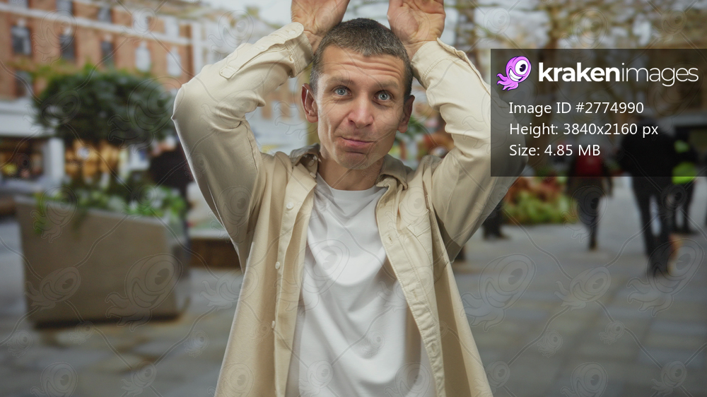 Caucasian man outdoors making rabbit ears gesture on a lively street with blurred pedestrians in the background, showcasing playful expression and casual style. - Kraken Images