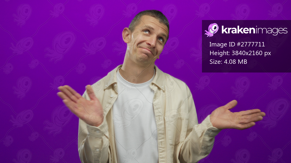 Caucasian man shrugging in thoughtful expression against an isolated purple background wall, wearing a casual shirt and projecting a nonchalant mood.