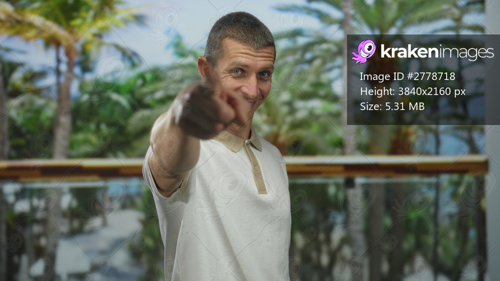 Caucasian man smiling in a park, wearing a white shirt and pointing with a blurred background of palm trees, showing a heart symbol with his hands.