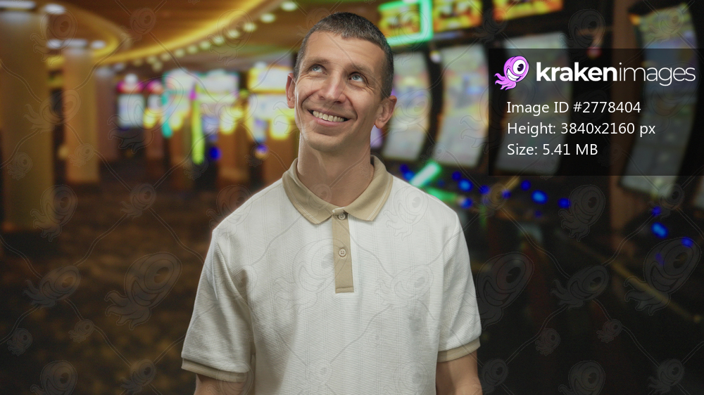 Caucasian man smiling in an indoor casino with vibrant slot machines lining the background, creating a lively and engaging atmosphere of leisure and entertainment. - Kraken Images