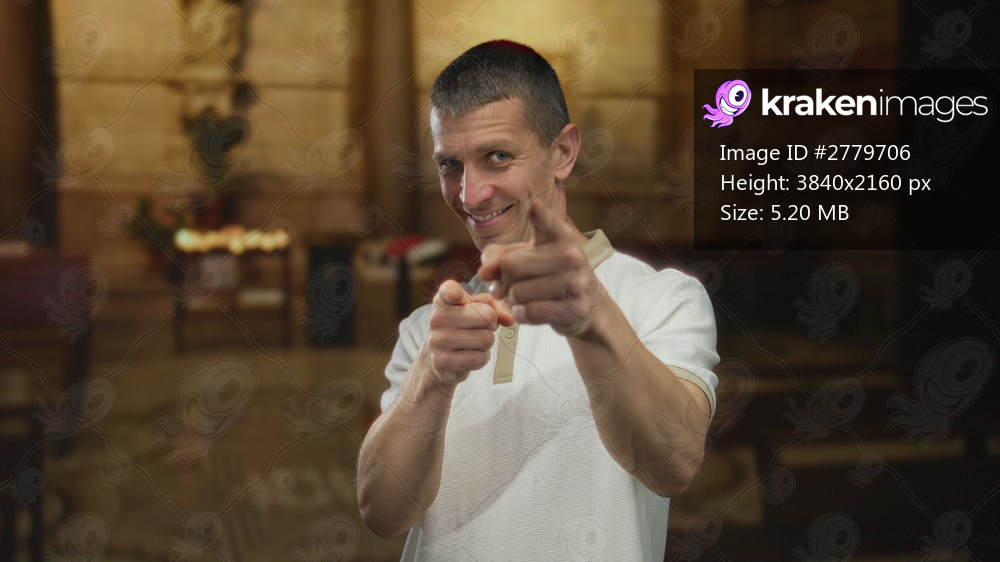 Caucasian man smiling and pointing indoors in a church, capturing a vibrant atmosphere with stone walls highlighted in the background.