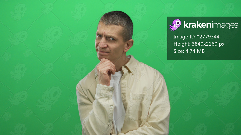 Caucasian man thinking poses against vibrant green wall background wearing casual shirt conveying contemplation.