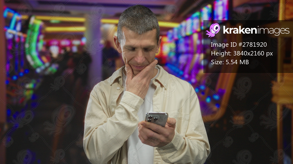 Caucasian man using smartphone in a vibrant casino, surrounded by colorful slot machines, focusing on his device indoors.
