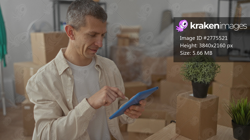 Caucasian man using tablet indoors surrounded by unpacked moving boxes and plants in living room of new home, showcasing transition into cozy apartment life. - Kraken Images