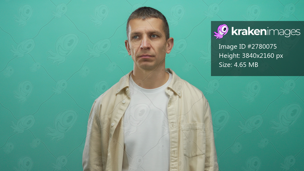 Caucasian man wearing casual beige shirt standing against isolated green background, displaying a neutral expression in a studio setting.