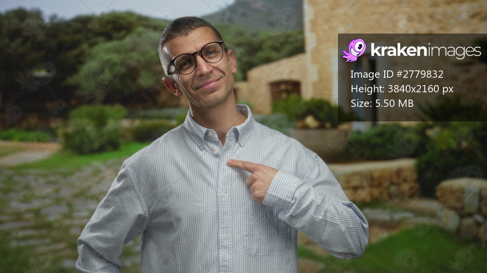 Caucasian man wearing glasses points at chest in an outdoor park setting with a rustic building and greenery in the background, conveying confidence and ease - Kraken Images