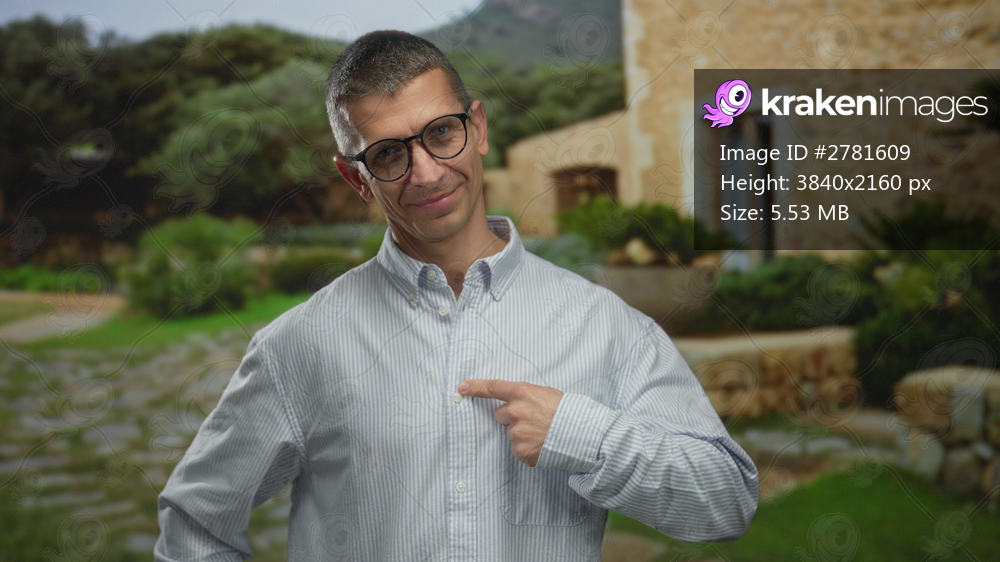 Caucasian man wearing glasses points at chest in an outdoor park setting with a rustic building and greenery in the background, conveying confidence and ease - Kraken Images