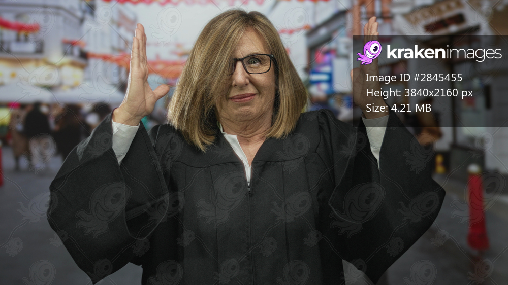 Caucasian middle age woman judge in black robe raises hands beside face in metropolitan city street; authority.