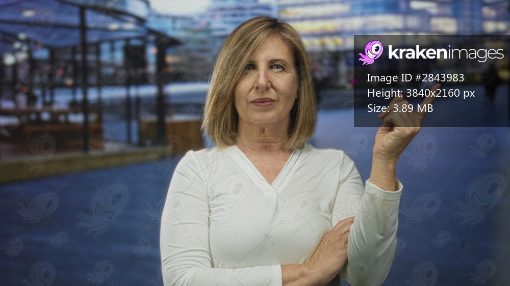 Caucasian middle aged woman finger pointing to object on street; confidence resolve assertiveness empowerment.