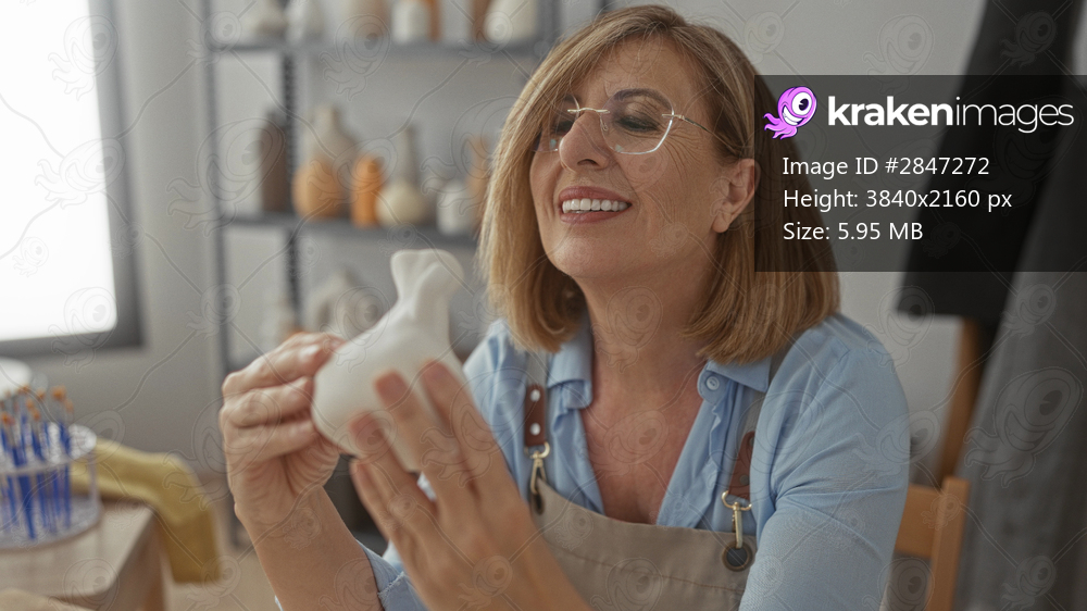 Caucasian middle aged woman holding handcrafted ceramic vase while smiling and inspecting its glaze in studio; satisfaction.