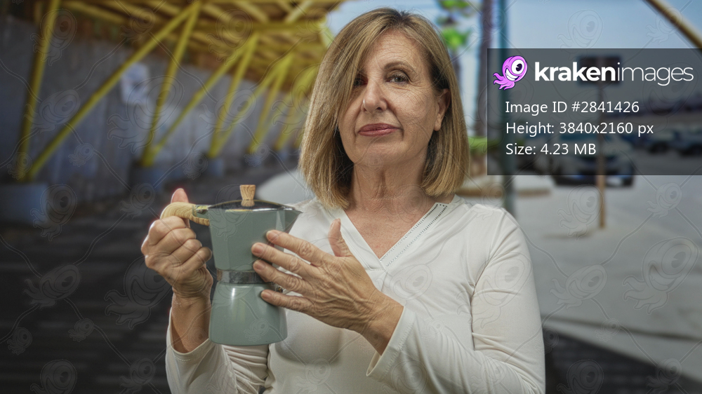 Caucasian middle aged woman holds green moka pot while covering mouth in yawn on urban street under daylight; fatigue.