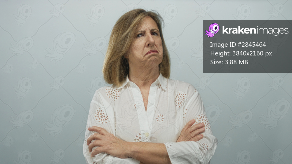 Caucasian middle aged woman in a white blouse with crossed arms in studio against pale grey backdrop; skepticism.