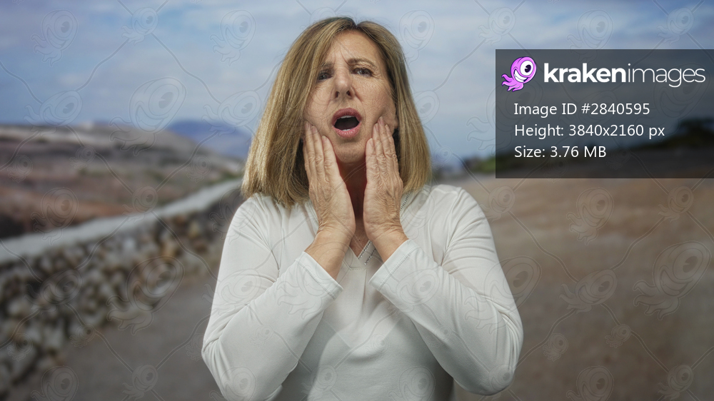 Caucasian middle aged woman presses her cheeks with both hands on outdoor street stone wall in daylight; pain.