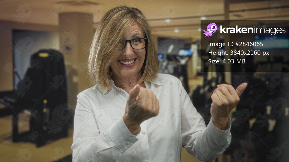 Caucasian middle aged woman smiling softly beckons with both bare hands in white shirt in gym building; invitation welcome.