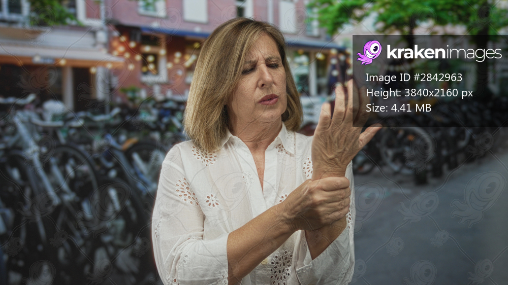 Caucasian middleaged woman in white blouse gently clutches wrist near crowded bike parking on urban street; discomfort.
