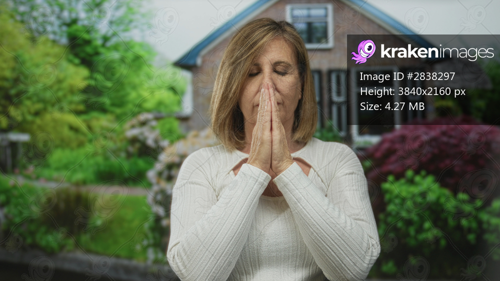 Caucasian middleaged woman in white long sleeve top with pressed hands prayer gesture at building entrance; serenity.
