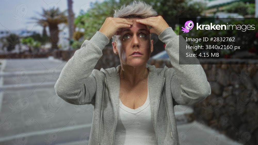 Caucasian middleaged woman wearing grey hoodie and white tanktop holding forehead with both hands on city street; stress.