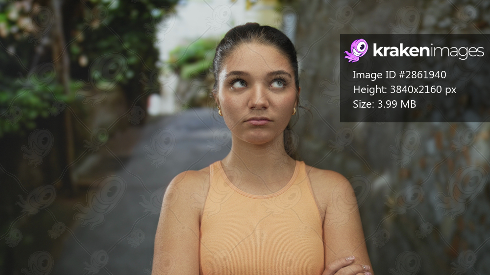 Caucasian teenage girl with bare arms crossed glancing upward in a narrow stone street framed by walls; rejection.