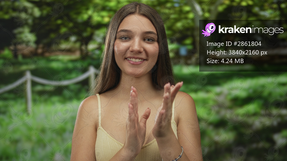 Caucasian teenage girl claps hands in forest surrounded by green foliage; joy togetherness celebration.