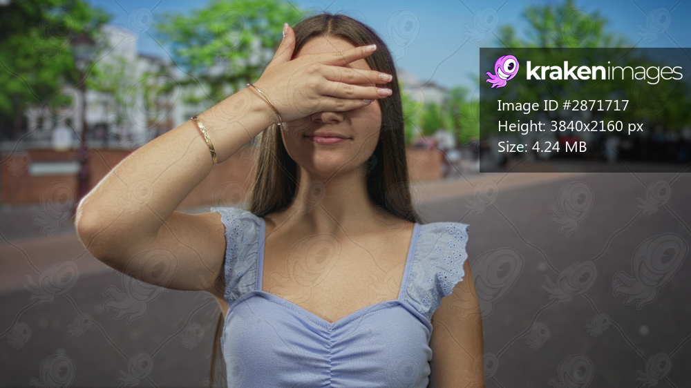 Caucasian teenage girl in light blue tank top casually covers eyes with hand on sunlit street under bright daylight; shyness.