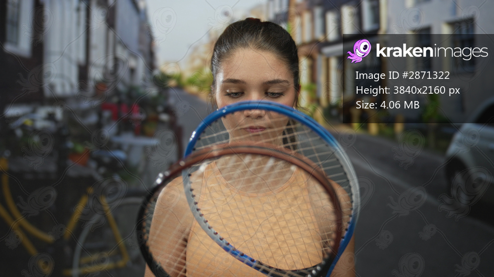 Caucasian teenage girl in orange athletic tank top holds two tennis rackets in sunlit street; uncertainty.