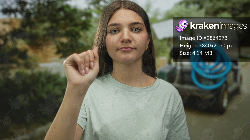 Caucasian teenage girl with long brown hair touches ear listening by golfcart on street wearing green t-shirt; calm reflection.