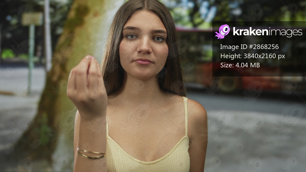 Caucasian teenage girl pinches fingers with raised hand on urban street with blurred bus behind; curiosity.