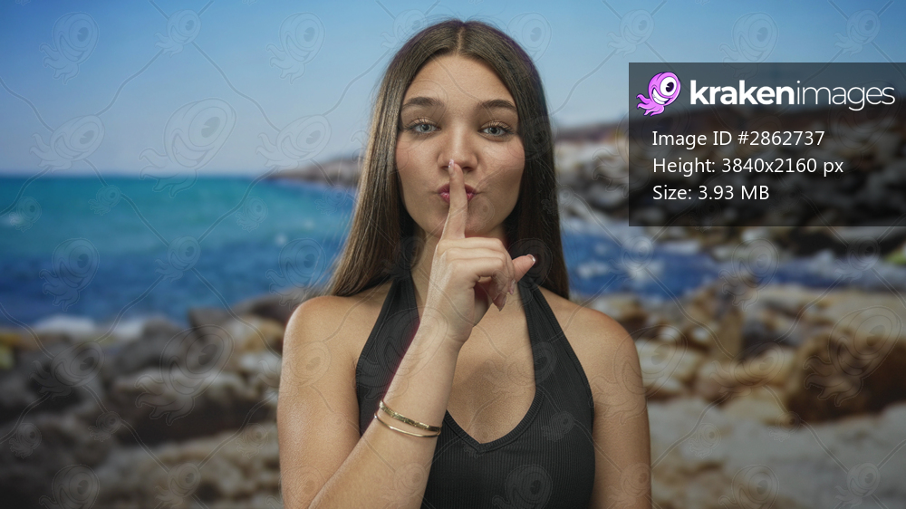 Caucasian teenage girl points her finger to lips at a sunlit sandy beach under clear blue sky; silence calm.