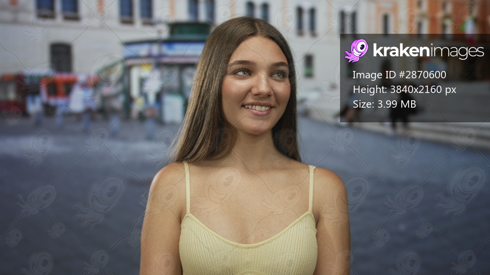 Caucasian teenage girl smiling on sunlit cobblestone street with historic building facade; youthful joy.