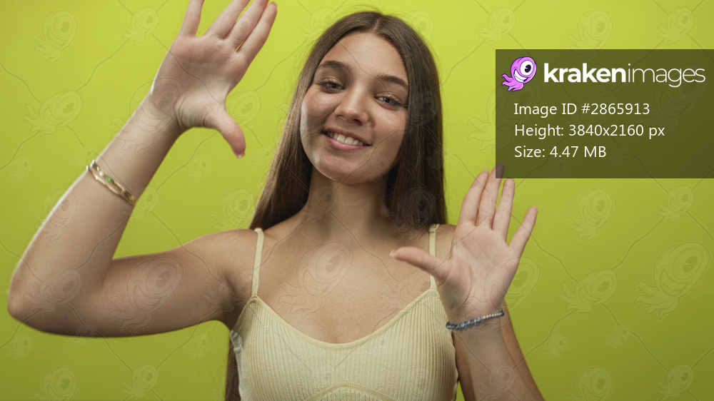 Caucasian teenage girl smiling and showing open palms in bright green studio with cheerful expression; joy connection.