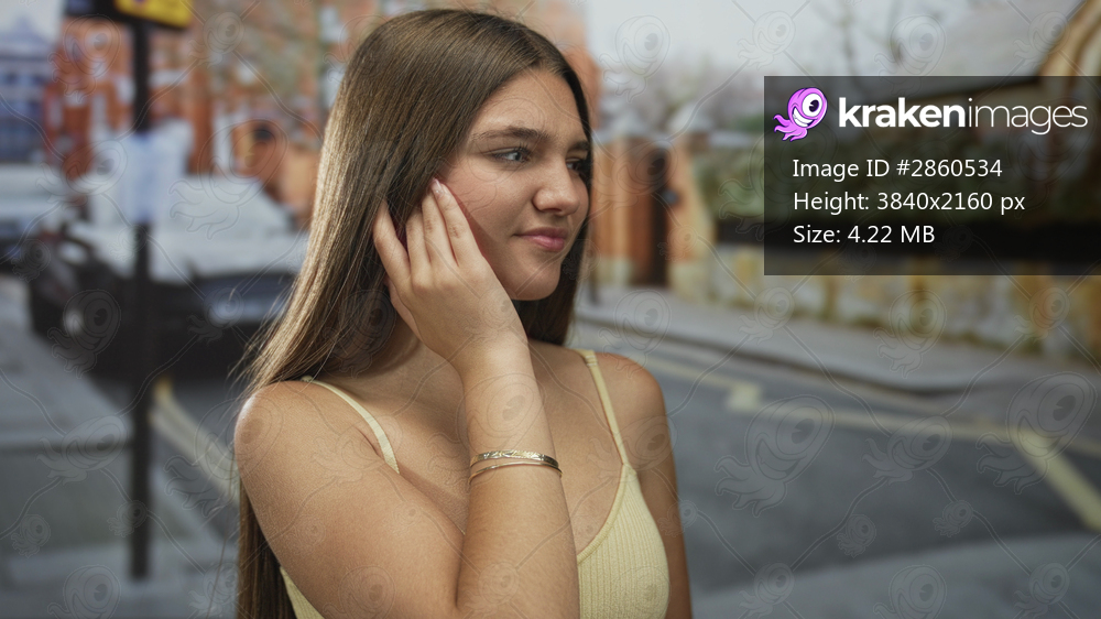 Caucasian teenage girl touches cheek while standing by a parked car along a narrow city street lined with brick buildings; serenity.
