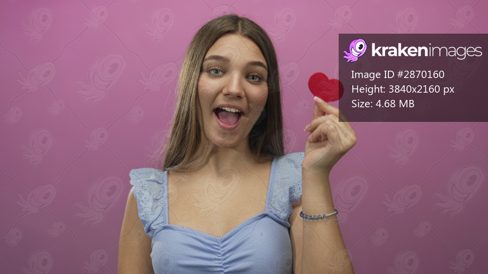 Caucasian teenage girl wearing a blue top smiling while holding a red paper heart over one eye in pink studio; affection.