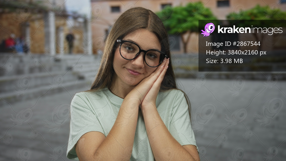 Caucasian teenage girl wearing glasses rests hands on cheek in quiet stone street; serene reflection.