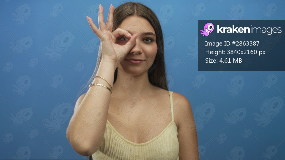 Caucasian teenager girl frames one eye with ok sign hand in blue studio, under soft lighting; approval.