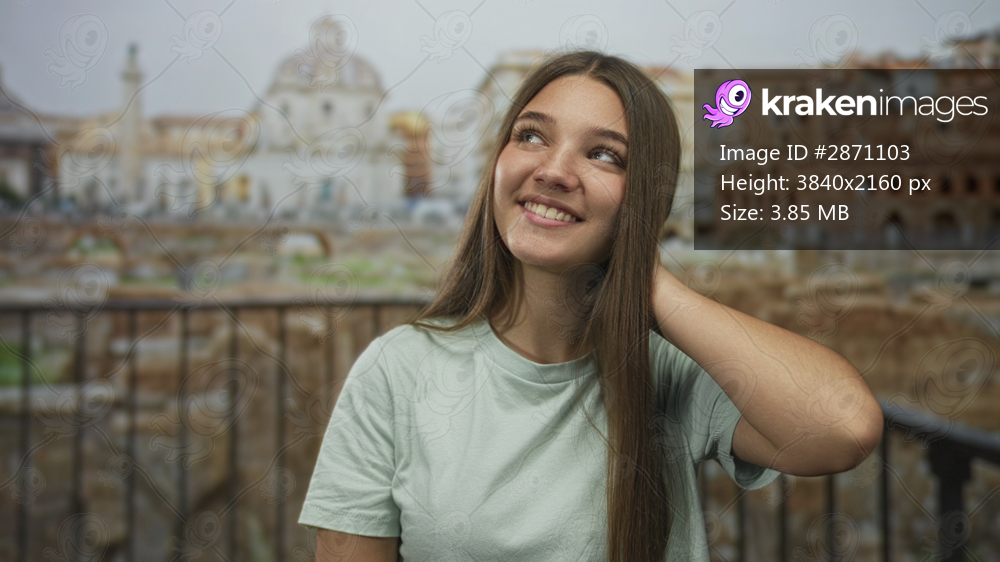Caucasian teenager with long hair touches hair at roman ruins building outdoors; serene exploration.