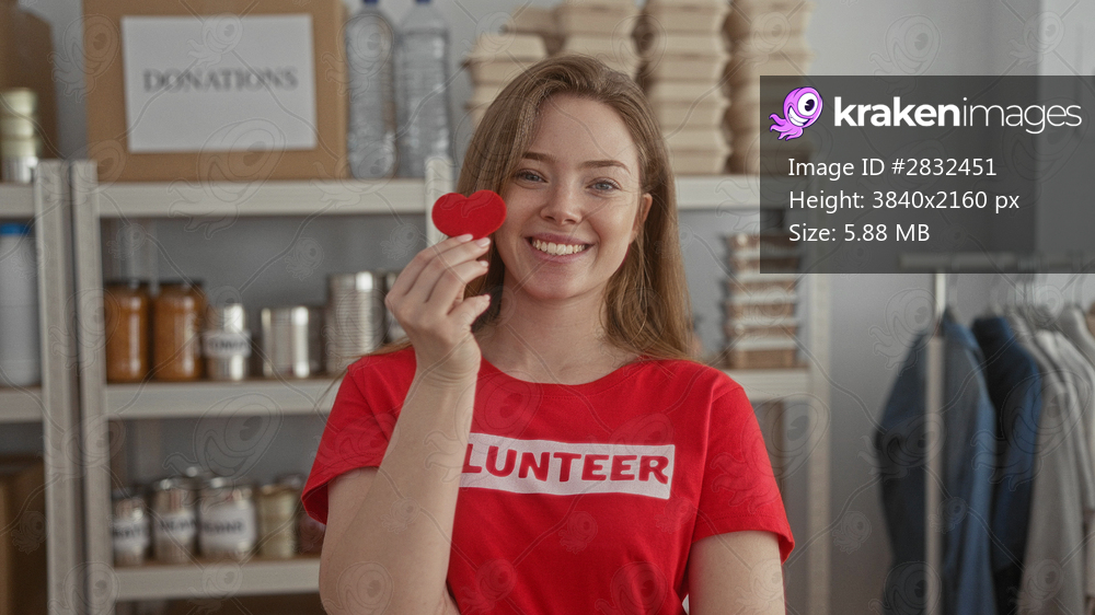 Caucasian volunteer woman smiling holds red heart in building donation center; charity spirit happiness.