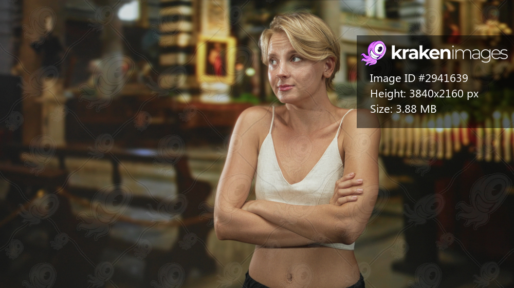 Caucasian woman with arms crossed revealing navel and wearing a white camisole inside a church interior with lit candles, wooden pews and paintings; contemplation thoughtful. - Kraken Images