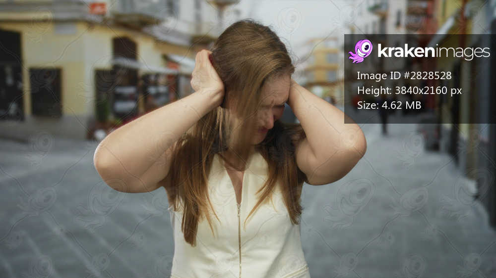 Caucasian woman covering her ears with both hands while grimacing on a busy street lined with buildings; frustration.