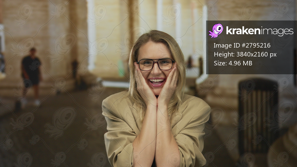 Caucasian woman with glasses and blonde hair appears surprised in an outdoor urban setting with historic architecture, expressing joy and excitement.