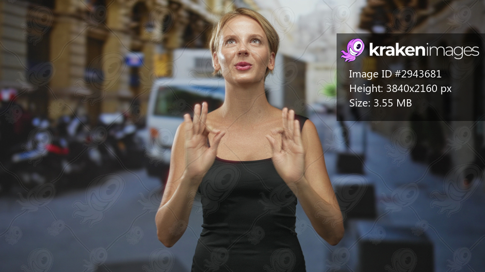 Caucasian woman with hands raised, palms forward and prayer hands gesture on a street; calm reflection.