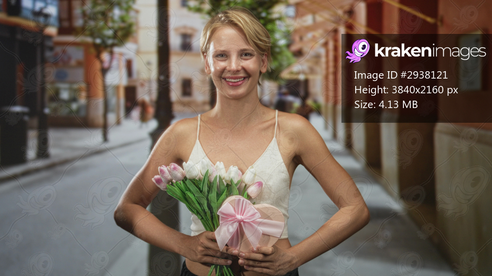Caucasian woman holding pink tulip bouquet and heart gift box, smiling with hands clasped on flowers on a city street; hopeful romance.